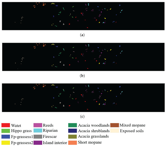 Figure 11. Ground truth map and classification maps of SSIGA on the Botswana dataset. (a) Ground truth. (b) Using SVM. (c) Using RF.