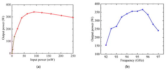 Beam-wave interaction performance: (a) Output power versus input power at 94 GHz; (b) Saturated output power versus frequency; (c) Gain versus frequency; (d) Electron efficiency versus frequency.