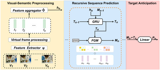 This study focuses on forecasting activity states at specific future time points by analyzing fixed-length video sequences in the context of egocentric activity prediction. Formally, given an observable video segment with time steps , we divide and obtain frame sequence at time interval , where each represents the frame at the corresponding time point. During the prediction phase, the model takes the observable segment of the sequence as input and employs a recurrent prediction mechanism to progressively infer the activity state at the specified target time point. The VFGF framework comprises three core components: virtual-semantic preprocessing, recurrent sequence prediction, and target activity generation. These components work synergistically to refine semantic sequences and dynamically guide predictions, effectively tackling the challenges of dynamic scenarios and long-term predictions. The design and implementation of each component are detailed below, emphasizing their critical contributions to accurate egocentric activity prediction.