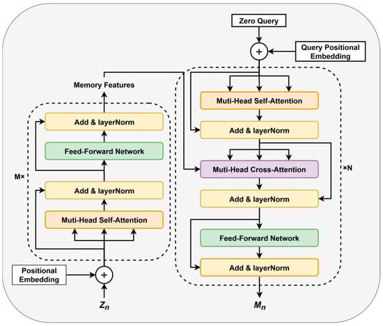 Next, the decoding process begins. The decoder, which includes transformer blocks, incorporates an additional multi-head cross-attention module to integrate the encoder’s output with the decoder’s query vectors . The are obtained similarly to , as shown in Figure 4. The cross-attention is computed as: