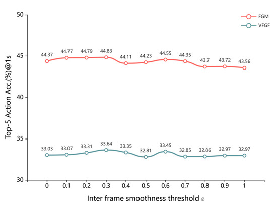 The experiments were implemented by Pytorch 1.10 and conducted through one NVIDIA RTX 3090 GPU. Experiments were conducted on the EPIC-Kitchens dataset. The model processes fixed-length 1.5 s video clips as input, targeting activity progression prediction at multiple future time steps (0.25 s, 0.5 s, 0.75 s, 1 s, 1.25 s, 1.5 s, 1.75 s, and 2 s). The observation time step is set to 6, providing six intervals of observed information, while the anticipation time step is set to 8 to define the prediction horizon. For fair comparison, all methods use identical input features, with video segments sampled at 0.25 s intervals, selecting only the video frames corresponding to these time steps. Subsequently, RGB and optical flow features are extracted via a pretrained TSN model [2], each modality comprising 1024-dimensional spatiotemporal features. Additionally, 352-dimensional object features are derived from [12]. The features from all three modalities are normalized before being input into the prediction model. All models are followed by a linear layer at the final stage to output a probability distribution over 2513 actions as predictions. Results are sourced from the respective papers or reproduced using their published code, with experiments conducted using a fixed random seed and identical feature extraction and data splits for consistency. The FGM employs a transformer-based encoder–decoder architecture, utilizing self-attention and cross-attention mechanisms to capture long-range temporal and spatial dependencies, enhancing the model’s capability for complex activity prediction tasks. For feature extraction, multimodal data consistent with prior methods are used, with features adopted from [12] to ensure comparability. To enable fair comparisons with state-of-the-art methods, the TSN model, pretrained on a large-scale dataset as provided in [2], serves as the visual feature extractor. The recursive aggregator is implemented using a GRU, with its hidden state dimension aligned with the input visual feature dimension, and the classifier consists of a linear layer. In the virtual frame augmentation module, a similarity threshold of 0.3 is set to ensure smooth inter-frame transitions, determined through ablation studies reported in Section 4.5.2. The FGM is configured with 8 attention heads, and both the encoder and decoder consist of 2 transformer blocks each. Model parameters are optimized using the stochastic gradient descent optimizer with a learning rate of 0.05, momentum of 0.9, weight decay of , and batch size of 128, of 0.1. The FGM is pretrained on the EPIC-Kitchens dataset with the same train-validation split as VFGF. Pretraining runs for 100 epochs with cross-entropy loss, using early stopping after 10 epochs of no validation loss improvement and a 0.05 dropout rate to prevent overfitting, ensuring robust feature extraction for VFGF’s long-term prediction.