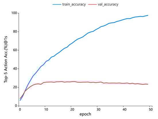 To rigorously evaluate the generalization capability of the Virtual Frame-Augmented Guided Forecasting (VFGF) framework, comprehensive experiments were conducted on the EPIC-Kitchens dataset using 5-fold cross-validation to ensure robust and reliable train-validation splits, with a training-to-validation ratio of 2:8. The Feature Guidance Module (FGM) was pretrained for 50 epochs using stochastic gradient descent (SGD) with a learning rate of 0.05, momentum of 0.9, weight decay of 0.0001, and a batch size of 128. Subsequently, the VFGF framework was trained for an additional 50 epochs using cross-entropy loss to optimize its predictive performance. Figure 6 illustrates the median performance across five experimental runs, with the blue line representing the convergence of training accuracy and the red line indicating the convergence of validation accuracy. The VFGF model achieved convergence on the validation set by the 16th epoch, attaining a Top-5 accuracy of 26.21%. However, the training accuracy curve indicates overfitting beyond this point, with training performance continuing to improve while validation performance stabilizes or declines. This rapid convergence and competitive Top-5 accuracy underscore the efficacy of virtual frame augmentation and the FGM in enhancing model robustness. These advancements enable VFGF to deliver consistent and high-quality performance across diverse egocentric scenarios in the EPIC-Kitchens dataset, demonstrating its strong generalization potential.