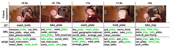 The Virtual Frame-Augmented Guided Forecasting (VFGF) framework achieves state-of-the-art performance on the EPIC-Kitchens dataset, demonstrating the effectiveness of virtual frame augmentation and the Feature Guidance Module (FGM). Compared to the Self-Regulated Learning (SRL) framework [14], VFGF produces Top-5 predictions that align more closely with ground truth, as shown in Figure 7, where correct predictions for “take_tray” at +0.75 s match the 2 s ground truth (highlighted in green), underscoring FGM’s role in enhancing semantic guidance. VFGF outperforms SRL in short-term predictions but, like SRL, faces performance degradation at +1.5 s due to error accumulation. Against TransGRU [16], a Transformer-based model, VFGF offers competitive accuracy with lower computational complexity due to its hybrid GRU-Transformer architecture. Unlike traditional recursive methods [12,13,14,15], which rely heavily on local data and suffer from error accumulation, or other Transformer-based approaches [16,17,18,19,20,21], VFGF leverages virtual frame augmentation for improved semantic continuity and combines GRU’s localized temporal processing with Transformers’ global dependency modeling, achieving a balance of efficiency and robustness motivated by the need to address error accumulation and computational demands in dynamic egocentric scenarios.
