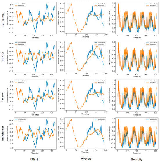 In time series forecasting tasks, the input length determines the amount of historical information available to the model. A longer look-back window allows the model to capture a broader range of past observations, thereby expanding its perceptual scope. Following the approach in the PatchTST [39] study regarding the selection of the look-back window size, this study designed two experimental models for this study: FCP-Former-336, with a look-back window length of 336, and FCP-Former-512, with a look-back window length of 512. Since a longer look-back window inevitably leads to increased memory overhead, this study dynamically adjusted the batch size to balance memory consumption. Due to the limited size of the ILI dataset, with only 966 data points, increasing the input length leads to a reduction in the training set size. For FCP-Former-512, using the dataset split as shown in Table 2, the training set consists of only eight data points, making training impossible. Similarly, for FCP-Former-336, the training set contains only 184 data points, which is insufficient for adequate model training. Therefore, this study did not conduct experiments on the ILI dataset. For the remaining datasets, the comparative results of FCP-Former (look-back window length of 96), FCP-Former-336, and FCP-Former-512 are presented in Table 5. For small-scale datasets, such as ETTh2, FCP-Former-512 achieves an average MSE of 0.342, compared with 0.365 for the vanilla model, while the MAE also improves from 0.395 to 0.392. For large-scale datasets, on the Weather dataset, FCP-Former-512 attains an average MSE of 0.226 and MAE of 0.270, both lower than those of the original model (0.245/0.275). Based on the work of Wang et al. [48], it is evident that due to the presence of repeated short-term patterns in the data and the difficulty of Transformer models in effectively capturing and modeling these short-term patterns, the performance of Transformer-based models often deteriorates as the input length increases. This phenomenon explains the performance of FCP-Former-336, which, in a few specific cases, marginally outperformed that of FCP-Former-512. Overall, the performance of FCP-Former-512 surpasses that of both FCP-Former-336 and FCP-Former, particularly when the prediction length is higher, where its advantages become even more pronounced. The overall superior performance of FCP-Former-512, particularly for longer prediction horizons, suggests that FCP-Former performs well in capturing long-term temporal dependencies and in deeply extracting meaningful information from historical data.