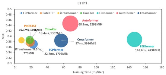Compared to PatchTST, FCP-Former achieved better forecasting performance while incurring only minor resource overhead: an additional 6 MiB of GPU memory and 3.6 ms per iteration. This demonstrated that the improvement in model prediction performance due to the frequency compensation layer far outweighs the resource overhead it introduces. Notably, the training speed per epoch (TSPE) of the patch-wise Transformer model for time series forecasting is significantly smaller than that of the point-wise Transformer model for time series forecasting. In contrast, iTransformer employs a different approach, treating the entire time series of each variate as a single token and applying attention along the variate dimension. This architectural choice inherently minimizes the computational overhead associated with temporal patching. In addition, as shown in Figure 6, this study provided a more intuitive comparison of the training speed, GPU utilization, and performance across multiple models.
