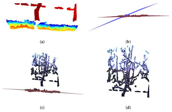 The output of the algorithm is the point cloud of the tree without grass or background structures, denoted as , in cases where grass was initially detected or objects were present in the background (see Figure 3d).