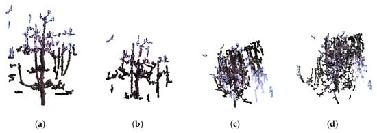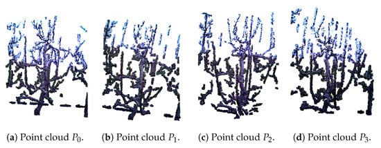 The algorithm for pear tree reconstruction is presented as Algorithm 2, which is explained using a pre-pruning dataset example seen in Figure 5. The input consists of four preprocessed point clouds: , representing different views of the tree. When combined, these provide almost complete scan of the tree. The first point cloud is always designated as the stationary reference and is referred to as the target point cloud, in Figure 5a, while the remaining point clouds are considered source point clouds, in Figure 5b–d. The algorithm is designed in a way that the final integrated point cloud remains aligned within the reference frame of the initial target point cloud.