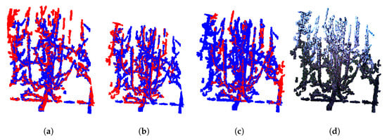 Example of the reconstruction process of the pear tree before pruning. (a) Registration of and . (b) Registration of and . (c) Registration of and . (d) Colored registration of and .