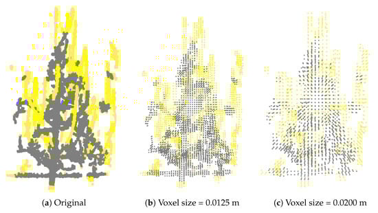 Comparison of the same model with different voxel sizes. Yellow points represent ground truth points belonging to the pruned branches.