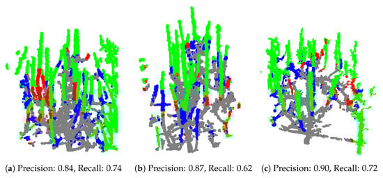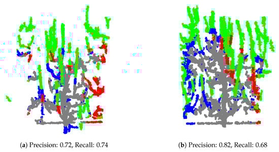 While quantitative metrics such as precision and recall provide valuable indicators of the model’s performance, they alone are insufficient to fully understand the causes of false predictions. These metrics do not offer insight into the specific reasons behind incorrect classifications, such as whether false positives are due to ambiguous features or ground truth inaccuracies. To gain a deeper understanding of the model’s behavior and to better assess its practical applicability, a visual inspection of the test samples was conducted. This qualitative analysis allows us to observe the pattern, context, and potential sources of errors that are not apparent from numerical metrics alone. We conducted a qualitative validation of the test samples from the chosen training variation with batch size = 2, learning rate = 0.0025, seed = 42, and npoints = min_points. Specifically, we selected the dataset with voxelization at 2.5 mm, as this variation achieved the highest precision within this training variation. The point clouds represent trees with predicted points indicating branches for pruning, with four different colors depicting the classification results: green for true positives (correctly predicted pruning points), gray for true negatives (correctly predicted non-pruning points), red for false positives (incorrectly predicted pruning points), and blue for false negatives (ground truth pruning points missed by the model). Among the test samples, three common scenarios emerged. First, some examples, like those shown in Figure 9, exhibit high precision, with the model accurately identifying pruning points.