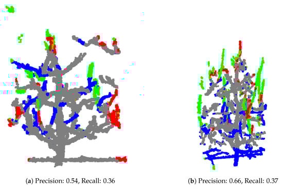 Further, there are cases where the predicted cutting points are very close to the ground truth, as illustrated in Figure 10. In such cases introduction of the post-processing module which will use information about tree morphology and pruning rules could be beneficial. This task is a complex task which requires collaboration with agronomy experts and is for sure one of the topics for our future research. We hope that introduction of such post-processing module will be able to improve pruning predictions obtained by PointNet++ or any other used neural network or algorithm.