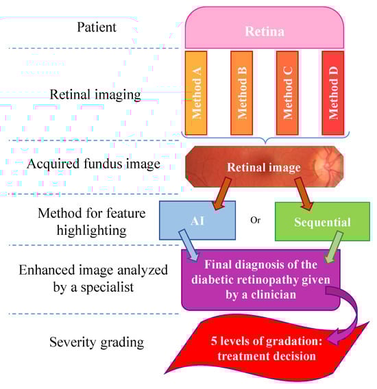 Once retinal images have been successfully acquired, they can be analyzed to identify and grade the patient’s ocular condition. This analysis can be performed manually by an ophthalmologist or other qualified professionals such as optometrists, general practitioners, or certified retinal graders, using computer-aided diagnostic tools. In recent years, automated methods—particularly those based on deep learning—have gained significant traction for DR detection, as outlined in the diagnostic flowchart in Figure 2. These methods generally fall into two categories: learning-based approaches and sequential (rule-based) processes.