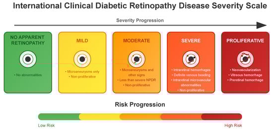 To facilitate diagnosis and clinical decision-making, diabetic retinopathy is typically classified into five standardized levels of severity: the International Clinical Diabetic Retinopathy (ICDR) severity scale. These levels, and their corresponding numbers commonly used in datasets, are detailed in Figure 3 and below [29]: