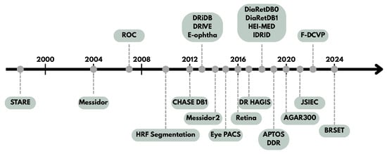 Each dataset is characterized by the number of images, image resolution, file format, geographic origin, year of publication, and whether the images include annotations. These databases originate from various regions around the world, including India, the UK, Finland, the USA, and France, offering a wide variety of imaging conditions and patient demographics. The databases were also published over a long period, as shown in Figure 4.