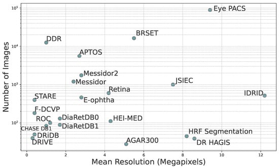 As previously mentioned, there is significant variation in the size of datasets and images. The second column of Table 1 reports the total number of images and Figure 5 shows a visual comparison of the mean resolution to the number of images in each dataset. Most datasets provide low-resolution images. This means that the image resolution is far below the high-definition (HD) standard of 1280 × 720 pixels and is closer to 640 × 480. High resolution allows for more detailed capture of the anatomical structures of the eye in fundus images, which is crucial for precise and comprehensive analysis of DR features. Fine details such as microaneurysms, exudates, and hemorrhages can be better visualized and assessed in high-resolution images, facilitating early detection of lesions and monitoring their progression over time. This can also contribute to improving the accuracy of image analysis algorithms and automated diagnostic tools used in both research and clinical practice. Image formats vary across datasets and include JPEG, PNG, TIFF, and BMP, with JPEG being the most common. The format—especially JPEG format—can affect image quality, which may in turn influence the reliability of image processing and feature extraction techniques.