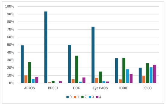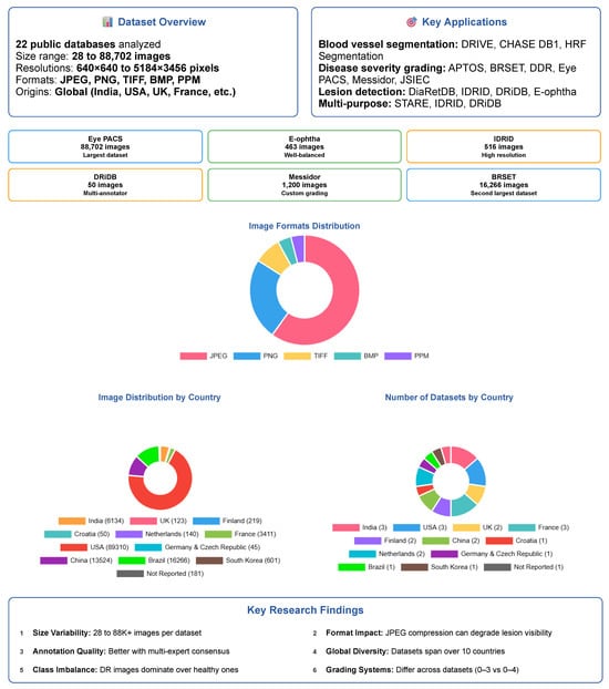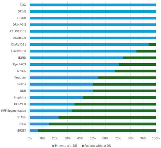 Another important characteristic of these databases is the proportion of patients without DR they include. A balanced representation of patients with or without DR is critical for training robust image analysis algorithms. A sufficient number of patients without DR not only improves classification accuracy but also reduces model bias and enhances generalization to real-world screening scenarios. An imbalanced dataset, particularly one heavily biased toward pathological cases, can lead to overfitting and poor performance in detecting normal retinas.