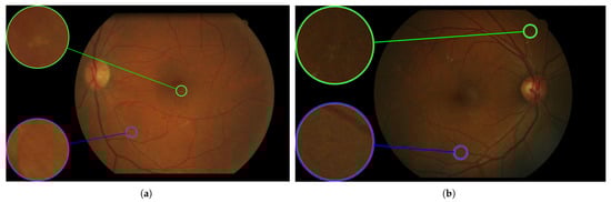 Symptoms of DR often develop gradually and may initially go unnoticed. Common symptoms include blurred vision, dark spots, difficulties with color perception, and sudden vision loss. Several risk factors influence the development and progression of DR, including the duration of diabetes, blood sugar control, hypertension, dyslipidemia, pregnancy, and smoking. Effective treatment options depend on the severity and stage of the disease and extend beyond ocular interventions such as laser photocoagulation, intravitreal injections, and vitrectomy [5,8,9]. Preventive care and management strategies are equally crucial and include regular eye examinations, strict glycemic control, management of comorbid conditions, and healthy lifestyle changes. A key diagnostic tool in DR screening and monitoring is the acquisition of high-resolution retinal photographs of the back of the eye, known as fundus images. These images reveal important anatomical structures such as the retina, optic disc, macula, and blood vessels. Higher-resolution images exhibit greater detail, thereby enabling the detection of early signs of DR and other ocular pathologies. As shown in Section 4.5.2, the detection of such pathologies can be challenging due to the small size of their lesions. As illustrated in Figure 1a, several important anatomical structures can be observed in a fundus image: