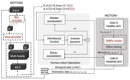 An adaptive DMP-based controller was developed to facilitate assisted motion of the exoskeleton, enabling accurate prediction and smooth synchronization of the robot’s motion trajectory. This achieves imitation of the master arm’s motion patterns by the follower arm, aligning with the requirements of mirror therapy. Although these methods achieve satisfactory performance in assisting human motion to complete prescribed tasks, they cannot accommodate patients’ abnormal postures or personalized needs.