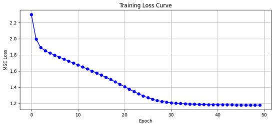 Using input trajectory data and predefined DMP parameters, the first output is generated: the DMP imitation learning trajectory for the unaffected side’s exoskeleton. This trajectory undergoes a mirror coordinate transformation in the human sagittal plane (x = 0) to obtain the ideal motion trajectory for the exoskeleton of the affected side. This constitutes the second output. The joint angles and velocities of the exoskeleton on the unaffected side are input into the kinematic encoder, revealing kinematic features . The sEMG data from the affected side are input into the biological encoder, yielding biological features . These two features are fed into the cross-attention module to compute the dynamic mirroring ratio coefficient , and Figure 3 illustrates the model’s loss decrease during training.