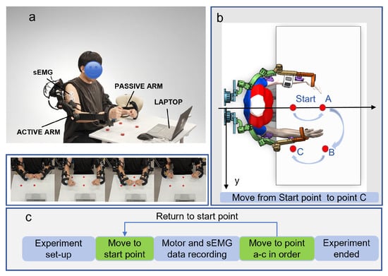Panel (a) illustrates the structural configuration of the bilateral upper-limb exoskeleton system. Panel (b) displays the motion trajectory of the arm-driven exoskeleton from a top–down perspective. Panel (c) schematically outlines the experimental workflow.
