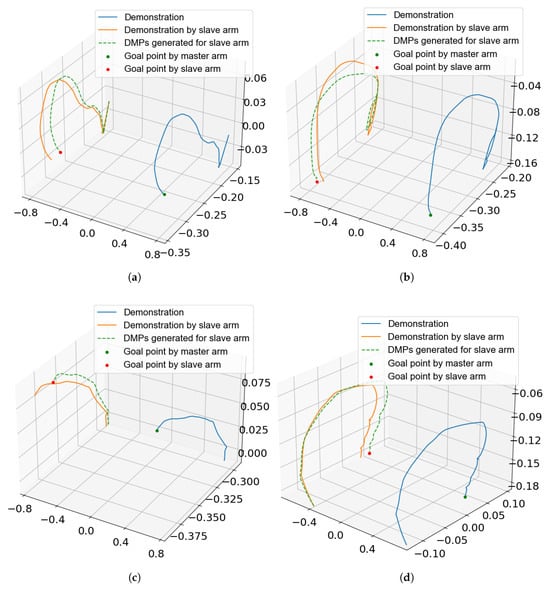 The figure illustrates the raw trajectory of the exoskeleton’s active endpoint, the mirrored trajectory under ideal conditions, and the actual trajectory generated via DMPs. (a) Endpoint trajectory from the start position to point A; (b) trajectory between points A and B; (c) trajectory between point B and C; (d) trajectory between point C and Start.