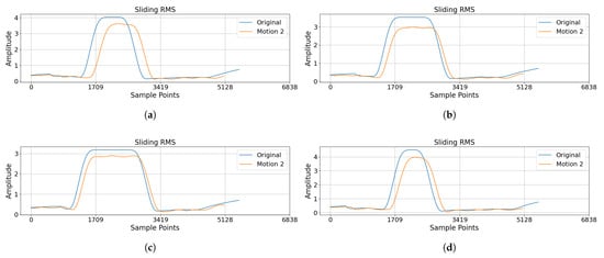 The experimental results demonstrate that, in Figure 9, the highest RMS values of the compared trajectories exhibit reduction ratios of 10.8%, 16.1%, 9.8%, and 12.4% in four movement segments, respectively. The mean RMS reduction ratio for all the segments is 12.3%. Compared to the original values, the RMS of the sEMG amplitudes was consistently lower when calculated using the dynamic mirror ratio controller in Motion2. Experiments with healthy subjects demonstrated that dynamic control enabled bilateral trajectory co-variation. In accordance with stroke rehabilitation theory, the motion synchronization achieved by the exoskeleton may provide neural activation conditions for patients. The primary goal of this stage of the research was to validate the functionality of the core algorithm under ideal conditions (i.e., healthy subjects), rather than to evaluate clinical efficacy. The current results merely indicate the system’s technical potential to support rehabilitation and do not address clinical application.