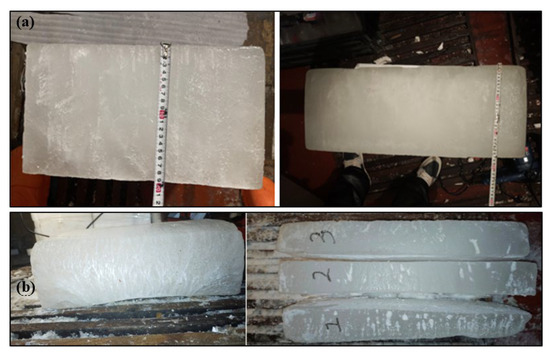 Upon completion, the prepared sea ice layers were cut and segmented for analysis, ensuring consistency in thickness and salinity profiles. Figure 2a shows the thickness measurements of ice made from different solutions, and Figure 2b shows the ice split layering.