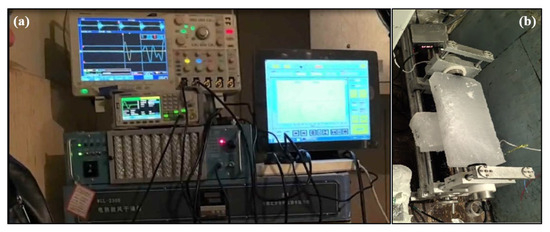 The experimental setup, illustrated in Figure 4a, ensures reliable signal transmission and reception while minimizing environmental interference. The transducers are fixed at both ends of the sea ice sample, as shown in Figure 4b, where the transducers are fixed to the ends of the long axis of the sea ice sample, and a coupling agent is applied to the surface to ensure safe and effective contact between the transducers and the sea ice surface.