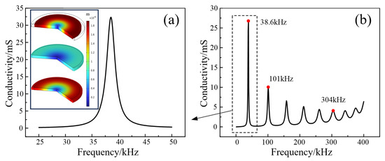 Conductance plot of a customized transducer. (a) Conductance plot of the 25–50 kHz transducer, where the vibration mode is mainly radial at 28.6 kHz. The thumbnail represents the amplitude of the transducer's radial vibration. (b) Conductance plot of the 0–400 kHz transducer.