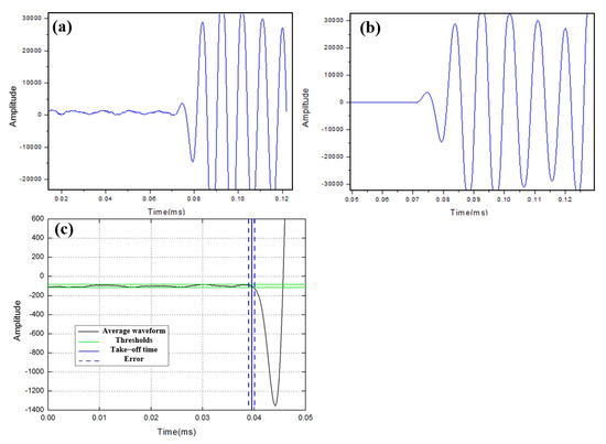The results and measurement errors before and after repeated measurements are shown in Figure 6. The frequency used for this error estimation is 100 kHz. The take-off time error range is ±0.004 ms for a single measurement, the measured length error range of ±0.3 mm, and the error range is ±48 m/s. The curve is obviously smooth after averaging 100 measurements of the same sample, at which time the error range of the take-off time is ±0.001 ms, and the error range of the sound speed is within ±12 m/s. The actual measurement was performed with a sample length of 100 cm to accommodate signals of different frequencies.