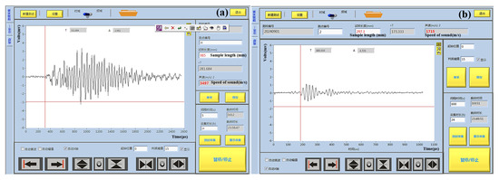 Measurements of the speed of sound with the integrated measurement program. (a) Measurement of the longitudinal sound velocity at an angle of incidence of 0° using a 25 kHz source. (b) Measurement of shear sound velocity at an angle of incidence of 180° using a 44 kHz source.
