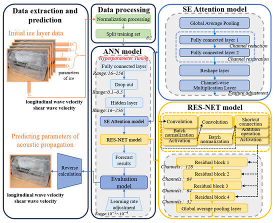With the advancement of scientific research, understanding the physical parameters governing acoustic wave propagation in sea ice has become increasingly important. Among these parameters, shear wave velocity plays a crucial role. However, as measurements progressed, it became apparent that there was a large discrepancy between measured values of shear waves and predictions based on empirical formulas or existing models. These inconsistencies stem primarily from the complex internal structure of natural sea ice, which significantly influences its physical behavior. Research reveals that shear wave velocity is not only influenced by bulk properties such as density, temperature, and stress state but is also sensitive to microstructural features, including air bubbles, inclusions, and ice crystal orientation. Compared to longitudinal wave velocity, the characterization of shear wave velocity is far more challenging due to these inherent complexities, underscoring the need for more precise measurement and modeling techniques. To address the challenges posed by the complex internal structure of natural sea ice and improve prediction accuracy, this study introduces a novel, integrated approach combining simulation, measurement, and inversion intelligent learning model. First, a laboratory-based method for generating sea ice layers under controlled formation conditions is developed. The produced sea ice layers align closely with measured values for Poisson’s ratio, multi-year sea ice density, and uniaxial compression modulus, particularly in the high-temperature range. Second, enhancements to shear wave velocity measurement equipment have been implemented. The improved device achieves measurement accuracy exceeding 1%, offers portability, and meets the demands of high-precision experiments conducted in harsh polar environments. Finally, according to the characteristics of small sample data. The ANN neural network was improved to a deep residual neural network with the addition of Squeeze-and-Excitation Attention (SE-ResNet) to predict longitudinal and transverse wave velocities. This prediction method improves the accuracy of shear and longitudinal wave velocity prediction by 24.87% and 39.59%, respectively, compared to the ANN neural network.