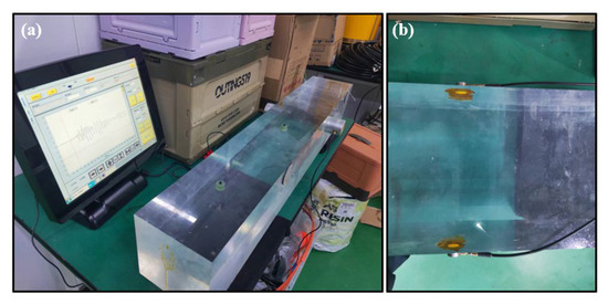 Accurate measurement of acoustic properties, particularly shear wave velocity () and longitudinal wave velocity (), is vital for modeling sea ice behaviors. Prior to stratified ice sample measurements, a standard glass sample measurement test is required to verify the accuracy of the measurement instrument. The standard glass sample device is shown in Figure 11a, and the transducer fixed position is shown in Figure 11b.