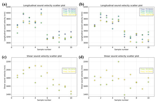 For frequency, due to the limitations of the fixed transducer frequency, the longitudinal sound velocity measurements were performed at four frequency points: 25 kHz, 50 kHz, 75 kHz, and 100 kHz. The shear sound velocity measurements were performed at two characteristic frequency points: 44 kHz and 50 kHz.