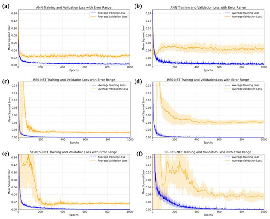 Training loss and validation loss, where orange represents the average validation loss over five training sessions, blue represents the average training loss ofiveer 5 training sessions, and light orange and light blue represent the validation loss error and the training loss error, respectively. (a) Training results of ANN for . (b) Training results of ANN for . (c) Training results of ResNet for . (d) Training results of ResNet for . (e) Training results of SE-ResNet for . (f) Training results of SE-ResNet for .