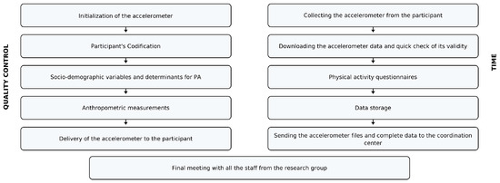 The device recorded acceleration data at a sampling frequency of 100 Hz with 13-bit analog-to-digital conversion within a range of ±16 g. The collected data were analyzed in non-overlapping 5 s epochs, with Mean Amplitude Deviation (MAD) calculated for each epoch [26]. During accelerometer initialization, the following parameters were set: (a) epoch length—6 s; (b) recording start time—immediately after activation; (c) interval between device initialization and participant wear—reduced to a minimum; (d) valid day/minimum number of days—>600 min of wear per day, ≥4 valid days including ≥1 weekend day; (e) non-wear definition—≥120 consecutive minutes of zero acceleration; (f) cut-points for physical activity—SB < 22.5 mg < LIPA < 91 mg < MPA < 414 mg < VPA; (g) missing data—only wear-time periods were analyzed (no imputation); (h) outliers/invalid records—flagged during quality control and excluded. The quality of the collected data was ensured thanks to the data harmonization structure (Figure 2).