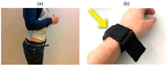 Accelerometer wear positions used for data collection: (a) hip placement during daytime—device attached at the waist/belt; (b) wrist placement during nighttime—device secured with a soft fabric wristband (yellow arrow) for comfortable sleep monitoring.