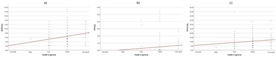 The correlation between subjective health status and cumulative time of MVPA (a), VPA (b), and PA10+ (c).