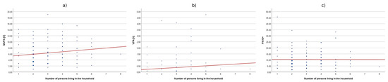 Statistically significant positive correlations between HEPA levels were also observed in groups categorized by household size. As the number of household members increased, so did the cumulative time spent in moderate-to-vigorous physical activity (MVPA) and vigorous physical activity (VPA). However, no significant correlations were found regarding the duration of activity bouts exceeding 10 min (PA10+). The results are presented in Table 5 and illustrated in Figure 5.