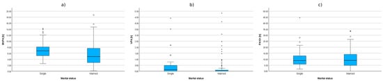 Another factor included in the correlation analyses was the participants’ marital status. Due to significantly unequal sizes of the groups of individuals in a relationship and those not in a relationship, the Mann–Whitney U test was applied. The analysis showed that individuals not in a relationship had significantly higher levels of moderate-to-vigorous physical activity (MVPA) and vigorous physical activity (VPA) compared to those in a relationship. The effect size for MVPA was small (η2 < 0.06), while for VPA it was moderate (0.06 < η2 < 0.14). Regarding physical activity sessions lasting 10 min or longer (PA10+), the differences were not statistically significant. Group differences by marital status were small to moderate implying modest practical significance despite statistical significance. The results are presented in Table 6 and illustrated in Figure 6.