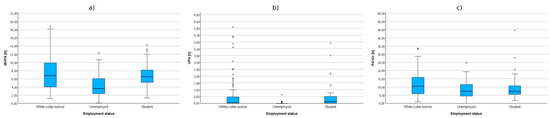 The final factor included in the correlation analyses was the employment status of the participants. The correlations between HEPA levels in groups distinguished by employment status were examined using the non-parametric Kruskal–Wallis test. The analysis revealed statistically significant differences between the compared groups in all three subcategories of health-enhancing physical activity. It is worth noting that in the case of MVPA, the observed effect size was moderate (0.06 < η2 < 0.14), while for VPA, it was large (η2 > 0.14). In contrast, for the cumulative time of physical activity performed in sessions lasting more than 10 min (PA10+), the effect size was small (η2 < 0.06).