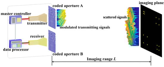 The forward-looking TCAI system comprises a master controller, data processor, transmitter, receiver, and two coded apertures A and B, as depicted in Figure 1. This system synchronously encodes both transmitted and echo signals, enhancing resolution beyond single-terminal encoding approaches [26]. Coded aperture A, which is positioned at the transmitting terminal, and aperture B at the receiving terminal are both controlled by the master controller. Both coded apertures A and B randomly modulate the amplitude or phase of the incident terahertz wavefront in different bit-depths. The transmitter emits single-terahertz wave beams in periodic pulses at fixed sampling intervals Ts. Coded aperture A applies random encoding to the transmitted signal, generating spatiotemporally uncorrelated radiation patterns. After interacting with scatterers on the imaging plane, echo signals are randomly encoded by coded aperture B and collected by the receiver. The data processor reconstructs the target image by solving the inverse problem formulated as a matrix equation incorporating the echo-signal vector, the large-scale RSM, and noise components.