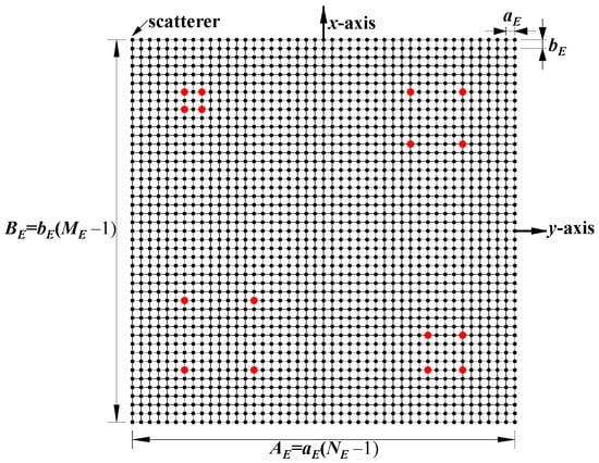 Configuration of imaging plane consisting of (ME − 1) × (NE − 1) rectangular cells with ME × NE scatterers located exclusively at vertices. Red points represent dominant scatterers (σ′ = 1).