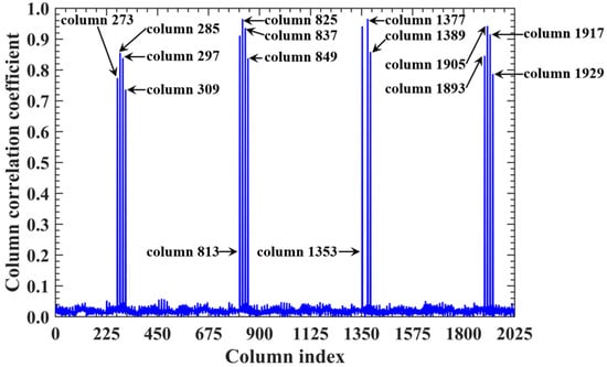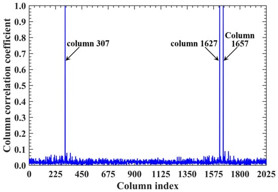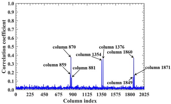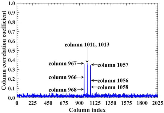 For a counterexample with the imaging range L = 2.5 m, the criterion implies that columns of RSM show considerable correlation when their corresponding scatterers with the row and column index differences ΔkM and ΔkN on the imaging plane are both around 11.19. Column 1365 is considerably correlated with eight columns of RSM St as shown in Figure 7, and their corresponding scatterers located on the imaging plane with row and column index differences of ΔkM and ΔkN = −11, 0 and 11 determined by , as shown in Table 3. However, the non-integer criterion suppresses peak correlations below 0.4, as shown in Figure 7. This suppression stems from phase difference vectors as shown in Figure 8, which span a broad portion of the [0, 2π] range for the four strongest correlations, contrasting sharply with the narrow concentrations observed at L = 6.7 m, as demonstrated in Figure 5. Such phase difference diversity prevents the column correlations from approaching unity. Consequently, the overall column correlation at L = 2.5 m as shown in Figure 9 is markedly lower than that with L = 6.7 m, as shown in Figure 6, which is directly attributable to the non-integer versus integer nature of the respective criteria .