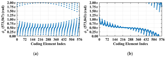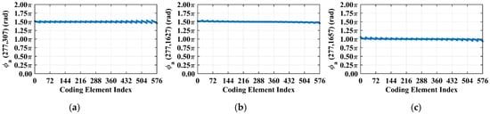 Phase difference vectors (a) , (b) , and (c) per Equation (19) concentrate at fixed values (~1.5π, ~1.5π, and ~π, respectively) across all coding elements. Such concentration stems from strong column correlation at L = 6.7 m with (Figure 4).