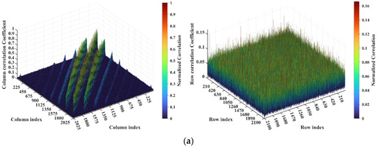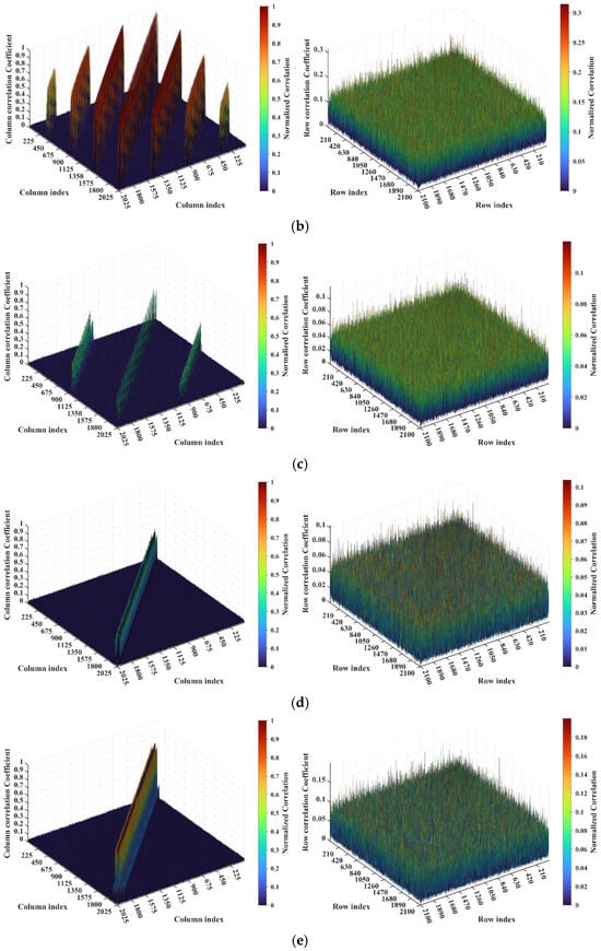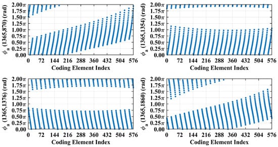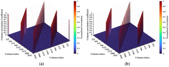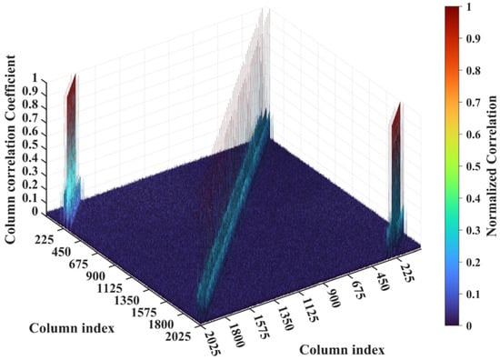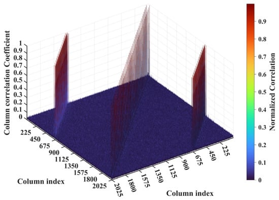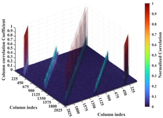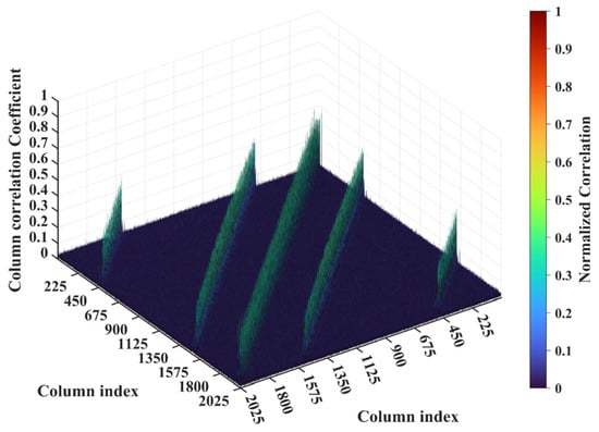 For a representative case with the imaging range L = 6.7 m, the criterion is an integer, indicating the existence of strongly correlated columns in the RSM St. As shown in Figure 4, column 277 of RSM St exhibits near-unity correlation with columns 307, 1627, and 1657. This stems from the narrow concentration of the phase difference vector , as shown in Figure 5. In Figure 5, remains stable at ~1.5π across all coding elements of the coded aperture, while and concentrate at ~1.5π and ~π, respectively. Such a phase concentration arises from the relative coordinate positions of these four scatterers on the imaging plane as detailed in Table 2, where their row and column index differences are exclusively either 0 or 30, determined by . These differences govern the correlation structure of RSM St as visualized in Figure 6.