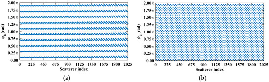 Consider imaging range L = 2.2333 m, where the criterion is an integer. For any pair of adjacent k1-th and k2-th scatterers on the imaging plane, the relative difference per Equation (25) . Consequently, the path length-induced phase difference vector is per Equation (24) for all scatterers on the imaging plane cluster near a set of highly discrete specific values spaced at interval , as shown in Figure 10a. Conversely, at L = 5.0 m, where the criterion is not an integer, uniformly spans [0, 2π], which is nearly the entire [0, 2π] range, as evidenced in Figure 10b. This confirms the theoretical principle: clustered phases enhance the row correlation of RSM St, while the diverse distributions suppress it, as shown in Figure 11a,b.