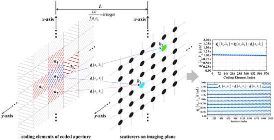 where and denote coordinates of the a1-th and a2-th coding element on the coded aperture, as shown in Figure 2. ΔkM and ΔkN denote the row and column index differences between the k1-th and k2-th scatterers, respectively. Thus and .