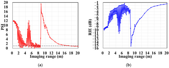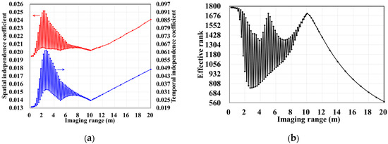 The above analysis demonstrates that spatiotemporal independence quantified by column and row correlations of RSM St can be assessed by the criteria rather than being inversely proportional to the imaging range L. Consequently, TCAI quality varies non-monotonically with the imaging range L. These findings are investigated in this section by analyzing the range-dependent PSI and RIE of the imaging results collaborated with evaluating the spatiotemporal independence and the effective rank.