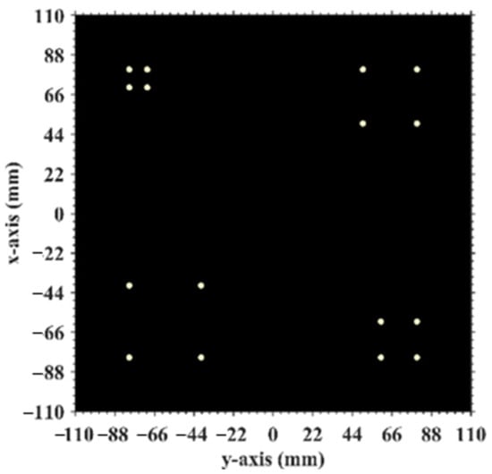 This section investigates the effect of the imaging range on the spatiotemporal independence characteristics of RSM St through theoretical and quantitative analysis, with primary parameters listed in Table 1. The frequency is chosen to be 670 GHz, which is a technologically feasible high-frequency point within an atmospheric window to enhance imaging resolution [28,29]. A signal-to-noise ratio (SNR) of 20 dB, a typical value in terahertz imaging studies, was set to simulate a practical scenario [9,25,26,30]. Identical coded apertures A and B, as shown in Figure 2, employ axial inter-element pitch to reduce system complexity while implementing a 1-bit random discrete phase-encoding scheme of ±0.5π phase shifts that delivers optimal resolution performance [26]. The imaging plane of the size AE × BE = 22 mm × 22 mm is discretized by ME vertical and NE horizontal grid lines, forming (ME − 1) × (NE − 1) rectangular cells with K = ME × NE = 2025 scatterers located exclusively at the cell vertices, as shown in Figure 3, comprising 16 dominant scatterers highlighted in red with the scattering coefficient σ′ = 1 representing four types of resolution—1 cm, 2 cm, 3 cm, and 4 cm—alongside 2009 dummy scatterers with σ′ = 0.